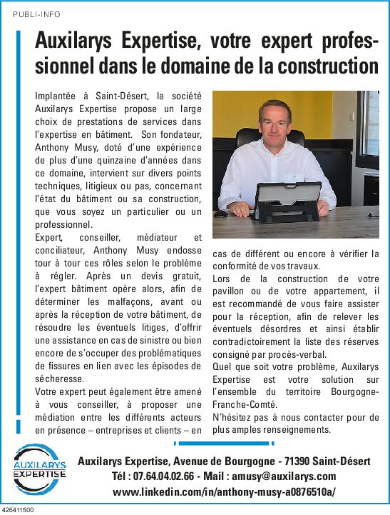 Anthony Musy, expert indépendant en litiges de la construction, accompagne particuliers, artisans, TPE et assureurs en Bourgogne Franche Comté (21, 71, 58).